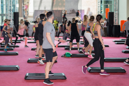 Fitness Workout in Gym: People doing Exercises in Class with Step Platform, Music and Teacher on Stage.