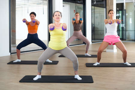 A group of sporting adult women exercising to strengthen their basic muscles in fitness training.