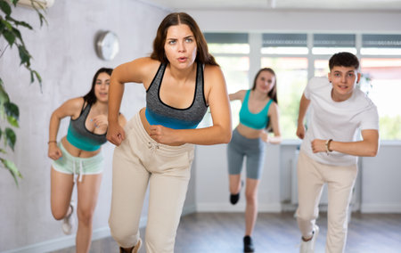 Happy young female leader of vogue dance performance group showing new movement to teenage performers at repetition in studio