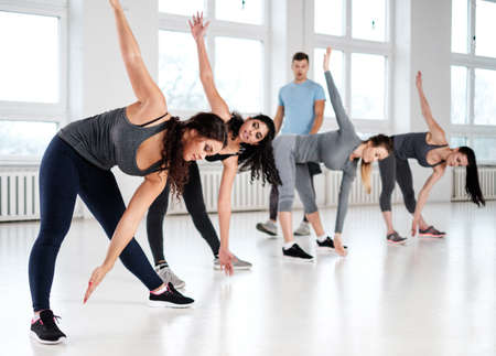 Group of flexible young dancers in sports clothes training together, doing splits and bending towards right leg