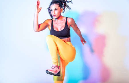 Three stylish young girls in colorful sportswear, bodysuits and leggings training, doing stretching and aerobics exercises