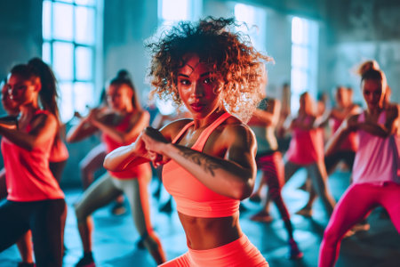 Focused Female Leading High-Energy Aerobics Class with Determination and Athleticism