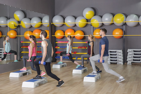 fitness, sport, aerobics and people concept - group of smiling people working out with dumbbells flexing muscles on step platforms in gym