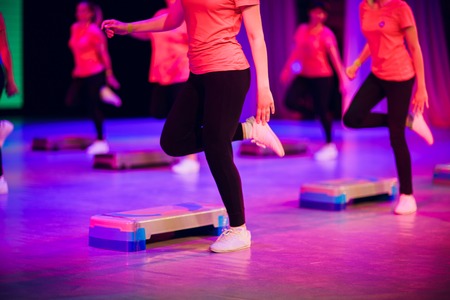 Standing on special platforms and doing legs exercises. Group of women practicing fitness in the gym.