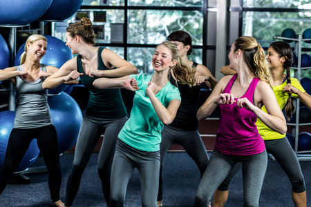 Group of four women, appearing young adult to middle aged, exercising together in fitness studio, smiling and performing coordinated aerobic workout movements