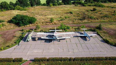 Old soviet aircraft and helicopter parked on exhibition area in open air museum. Abandoned military aircrafts. Drone view photo. Kharkov, Ukraine - August 23. 2021