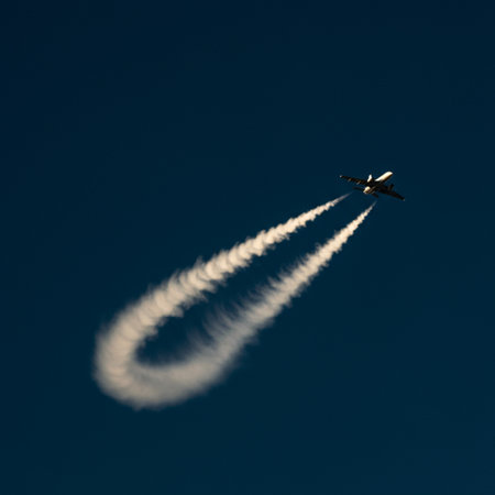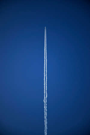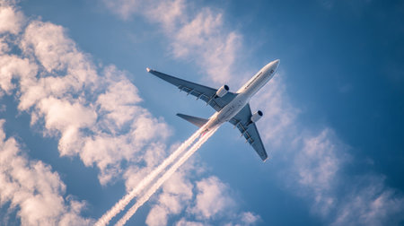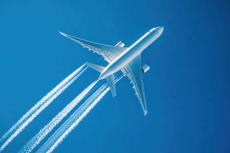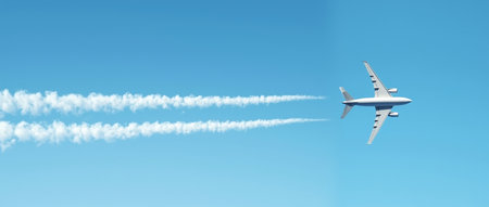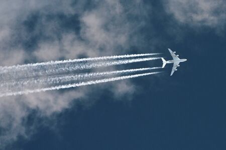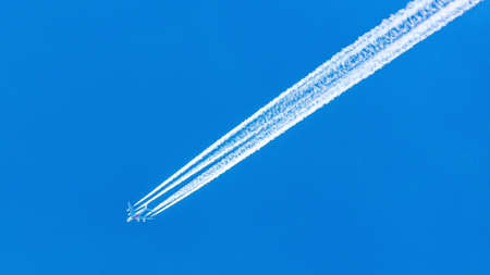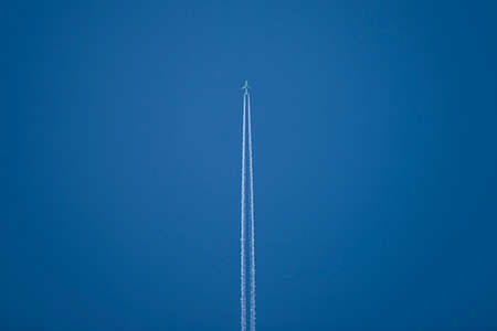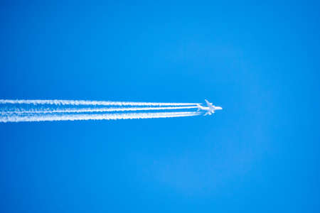 Passenger airplane flies high in the sky, leaving a long white trail behind, symbolizing travel and air transportation