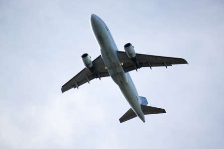 Odessa, Ukraine - CIRKA 2019: Passenger airplane in the air with landing gears lowered before boarding at the airport under different racks as an illustrative editorial