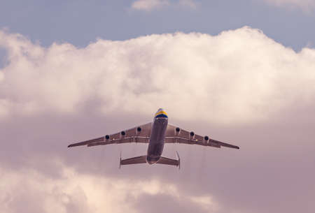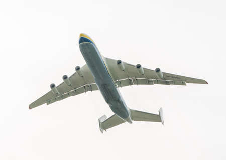 Antonov An-225 Mriya aircraft takes off from the Gostomel airport in Kyiv, Ukraine. This giant cargo plane is the heaviest aircraft ever built. Summer 2018