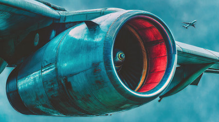 This image showcases a detailed view of an airplane engine, highlighting its metallic components and internal structure. The composition emphasizes the circular intake and surrounding surfaces. A contrasting red element is visible within. The shot uses shallow depth of field, possibly suitable for technical documentation or commercial aviation content.