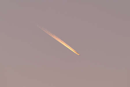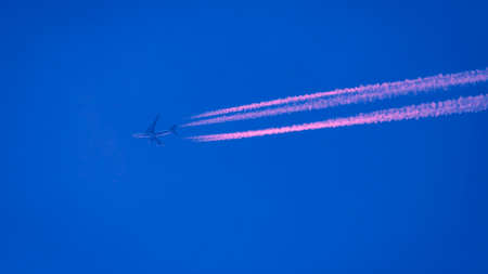 Airplane in a blue cloudless sky with colored colorful contrails without clouds during sunset and golden hour, Germany