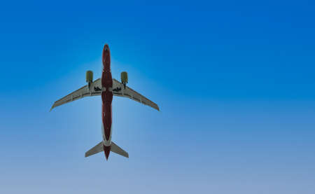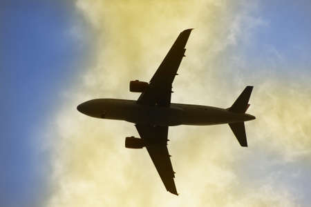 Airplane in the sunset sky flight travel transport airline background concept ..