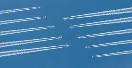Transportation competition concept: a jet airplane crossing other plane’s white contrail against blue sky background with copy space