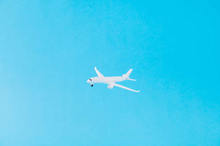 Picture of nice white aircraft plane flying cruise world exploring clear light sky isolated over bright vivid shine vibrant blue color background
