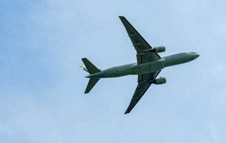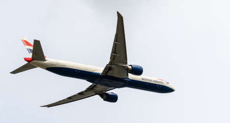 Heathrow, United Kingdom - August 03 2019: British Airways Boeing 777-36N registration G-STBD, flight number BA7 departs Heathrow airport en route to Tokyo seen from Myrtle Avenue