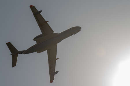 Big white airplane with four engines over blue cloudy sky taken from the ground