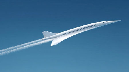 A sleek supersonic jet soars through a clear blue sky, creating contrails that highlight its advanced aerodynamic design, symbolizing modern travel and engineering.