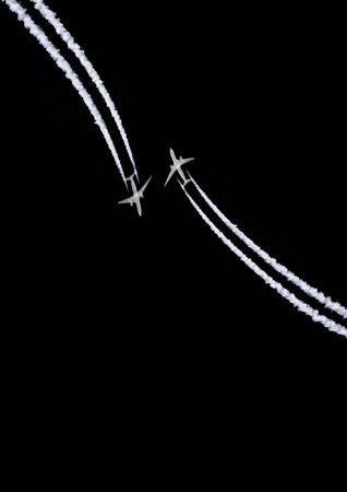 Abstract of two jet aircraft with smoke trails, veering away from each other to avoid a mid air collision. Set over black background.