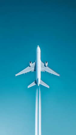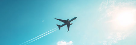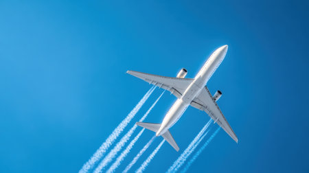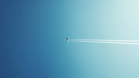 Experience the freedom of flight as a sleek jetliner cruises through the endless expanse of a deep blue sky, leaving a trail of white contrails. Evokes travel, adventure, and global connection.