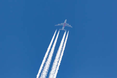 Large four engine passenger supersonic airplane flying from left to right high in blue cloudless sky leaving long white tracks