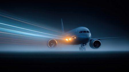 A jet plane is on the runway with its landing gear down. The plane is surrounded by a blurry background, giving the impression of motion. Concept of speed and movement