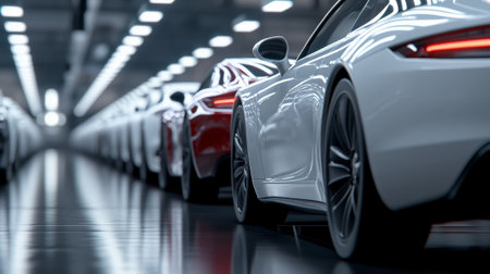 Modern sports car parked in a row on shiny metal lot generated by artificial intelligence