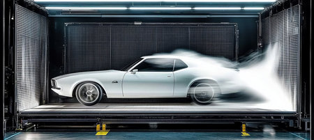 White Sports Car in Wind Tunnel with Smoke Trails, Automotive Design and Aerodynamics