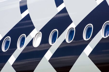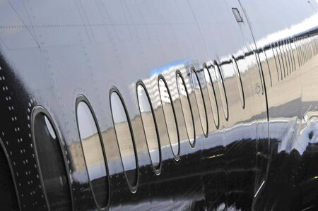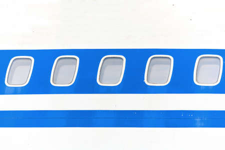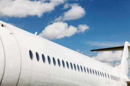 Windows and fuselage of a private airplane with tail against the cloudy sky