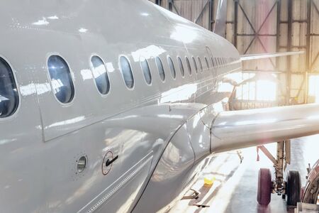 White passenger jet plane in the aviation hangar. Aircraft under maintenance. Checking mechanical systems for flight operations
