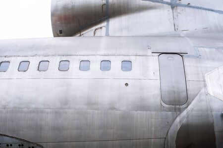 Abstract weathered silver metallic background. Metal texture. Fragment of the old airplane sheathing fuselage.