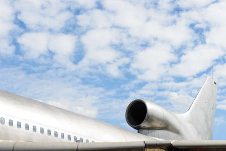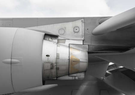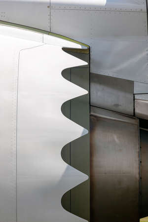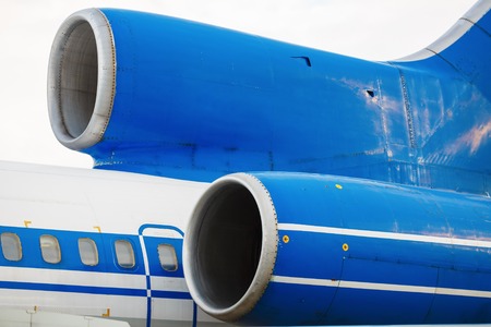 Close-up of a passenger aircraft turbine. Turbines of passenger airliner. The tail of the aircraft.