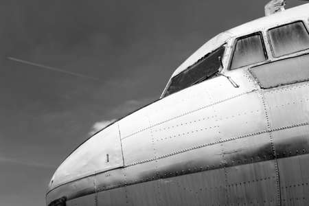 Close-up and high-view shot with beautiful blue sky background of airplane's head part which has been used for flight service for long time showing water stain and rust on the metal surface.