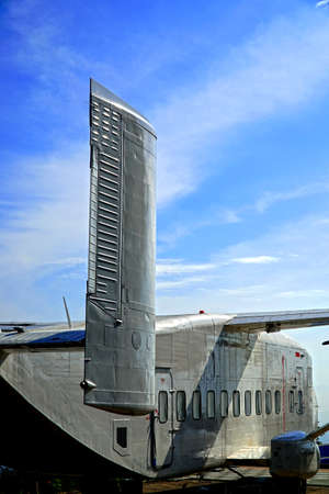 Close-up of airplane tail and wing with cloudy sky backdrop. Aviation detail highlights vintage fuselage and streamlined metal structure