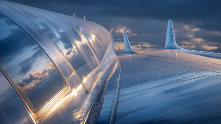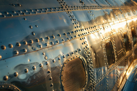 Close-Up of Riveted Aluminum Panels Reflecting Sunlight on Airplane Fuselage for Industrial Design