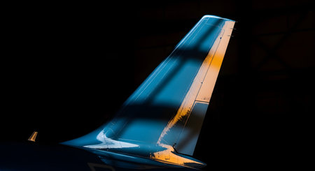 An artistic and abstract photograph of an airplane's tail fin, dramatically lit with blue and orange light against a black background inside a hangar. The lighting accentuates the sleek, aerodynamic curves and metallic surface of the aircraft.