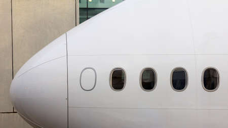 large heavy modern passenger widebody airplane nose section side close detailed exterior view with exit door handle, passenger windows, pilots in cockpit windshield wipers nose cone antennas sensors