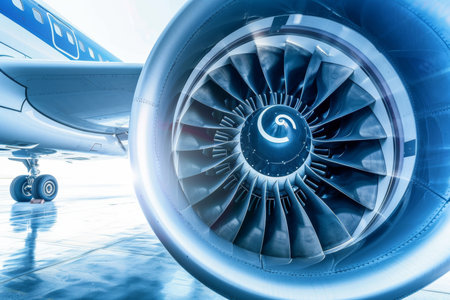 Close-up detail of a powerful jet engine, showcasing its intricate metal components and sophisticated engineering. Illustrates industrial technology, aerospace innovation, and the mechanics of modern aviation. Ideal for concepts related to power, speed, and advanced manufacturing.