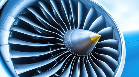 A stunning close-up of a jet engine turbine, showcasing its intricate design and polished blades set against a bright blue sky, symbolizing aviation innovation.