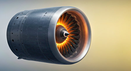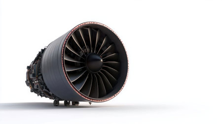 A detailed image of a jet engine, showcasing its intricate design and components, set against a clean white backdrop.