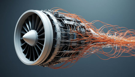a jet engine's turbine blades, with a focus on the circular pattern and intricate engineering