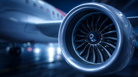 Striking close-up of an aircraft turbine engine, showcasing the intricate design and powerful machinery of modern aviation, against a blurred tarmac backdrop at night.