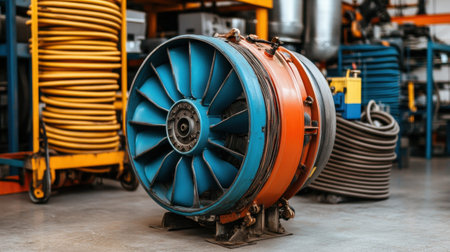 Close-up view of a colorful turbine engine component in an industrial workshop setting, showcasing advanced technology and engineering details.