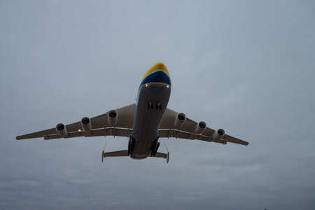 Kiev Region, Ukraine - January 8, 2012: Antonov An-225 cargo plane is landing on sunset
