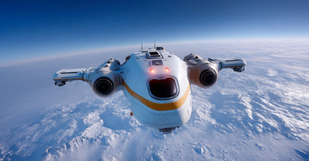 Robot spacecraft explores icy terrain during planetary expedition in search of life Generative AI