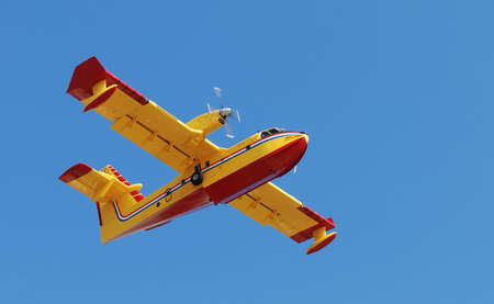 Hydroplane for the extinction of forest fires flying at sunset. Side and bottom view of the aircraft. Isolated.