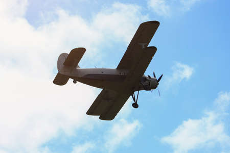 Retro biplane plane in the blue sky. Old airplane against blue sky