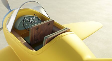 Top and closeup angle view of retro cute yellow and blue two seat airplane . 3D rendering .
