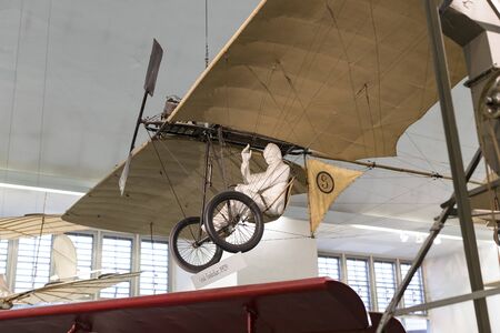 Brussels, Belgium - August 17, 2019: Antique aircraft with stickers over the fuselage inside aviation hall of The Royal Museum of the Armed Forces and Military History, famous museum in Brussels.