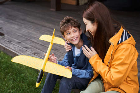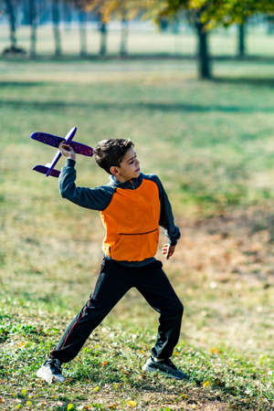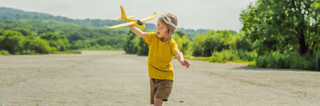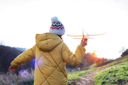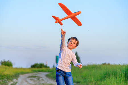 Boy throwing toy airplane in summer day on sunset. Child plays with a toy airplane dreams of journey.