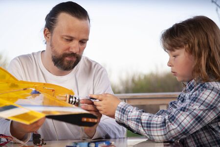 son and father made homemade radio-controlled model aircraft (airplane is hand made not copyright)